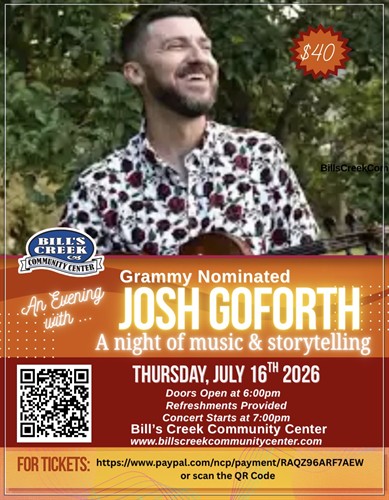 Join us for a special night of music and storytelling with Grammy-nominated musician Josh Goforth. Josh is bringing a whole new show to the Bills Creek Community Center.  A native of the Blue Ridge Mountains, Josh Goforth brings the mountains to life with hilarious stories, rich traditions, and toe-tapping tunes.